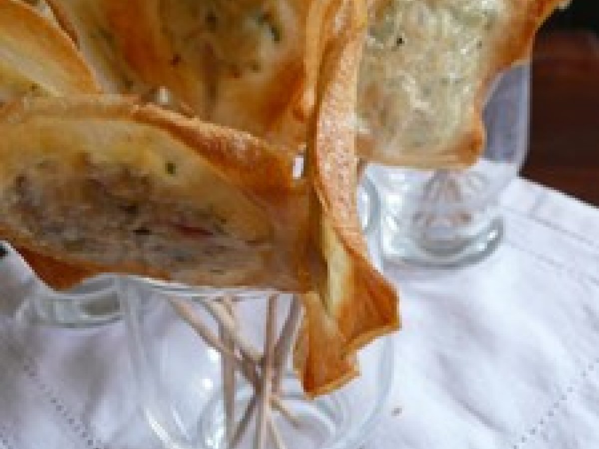 Badigeonnez d'émulsion 10 carrés. Déposez au centre 2 cuillères à café de farce. Glissez une pique à brochette au centre. - Refermez avec les 10 autres feuilles. Badigeonnez d'émulsion et appuyez autour de la farce pour bien souder les deux feuilles de brick.