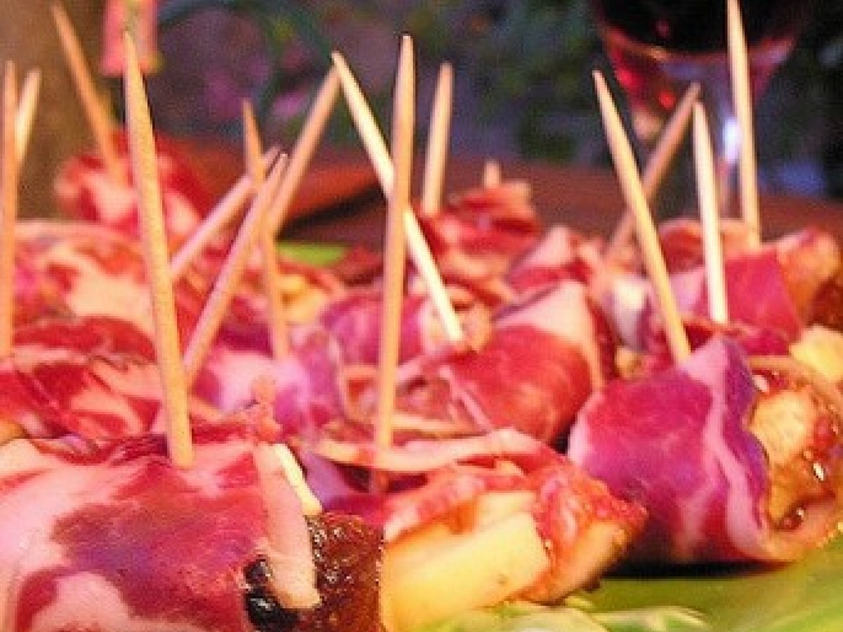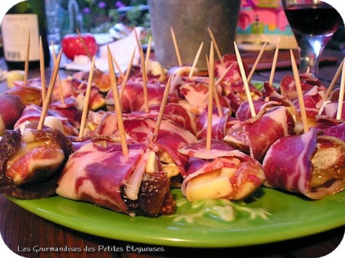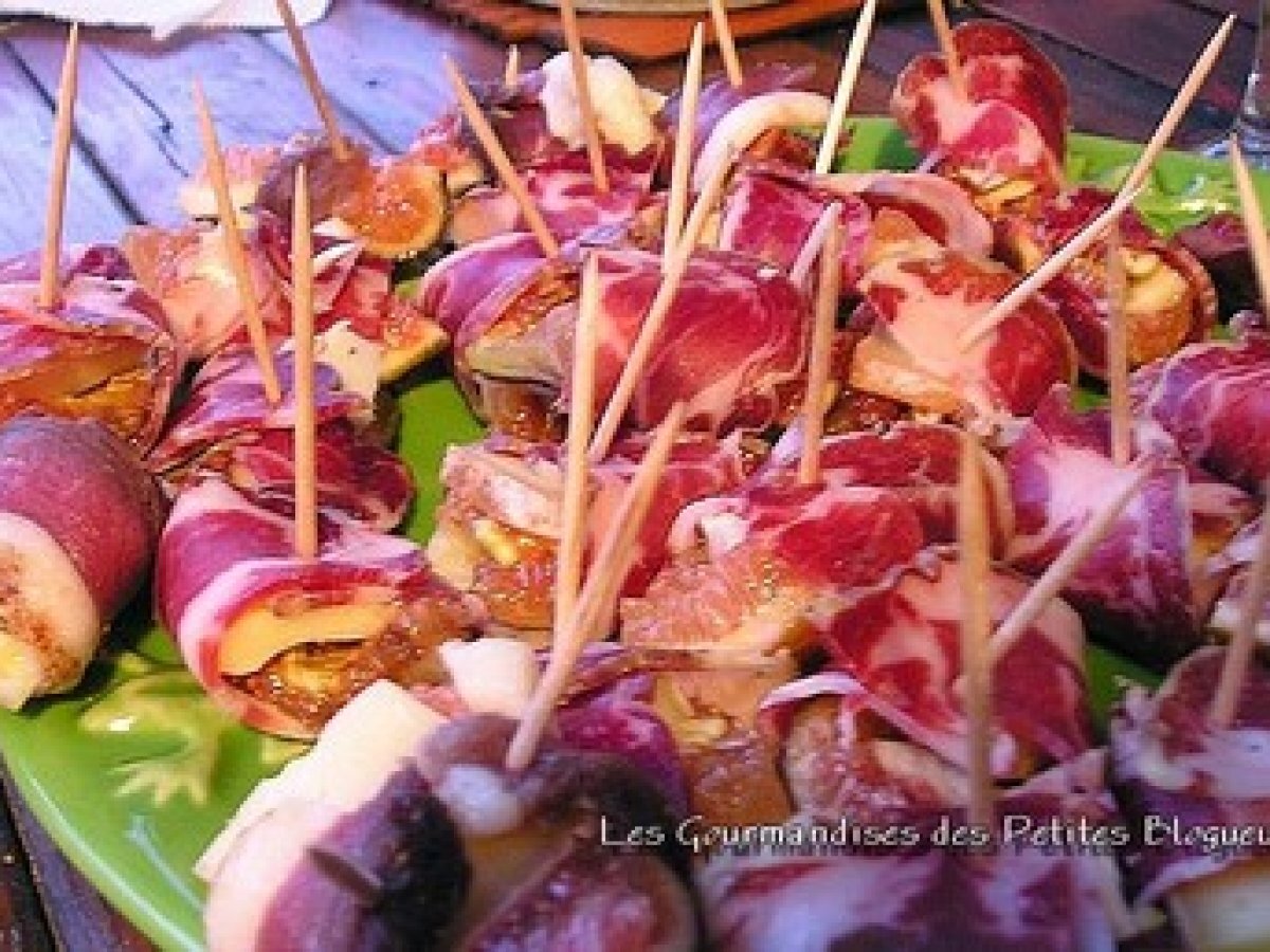 - Couper les tranches de coppa dans la longueur, poser sur chaque moitié 1/4 de figue, 1/2 cerneau de noix, un petit carré de fromage.