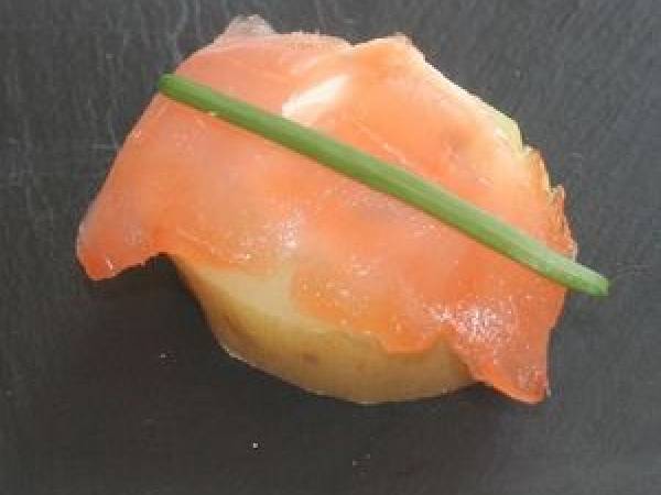 Cuire les pommes de terre à l'eau bouillante, laisser refroidir puis faire des rondelles d'un demi-centimètre d'épaisseur en gardant la peau. - Mélanger la crème fraîche avec quelques gouttes de citron et de la ciboulette ciselée.