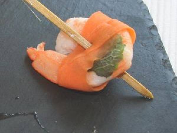 Assembler une crevette avec une feuille de menthe bardée d'un ruban de carotte, maintenu par un pique.