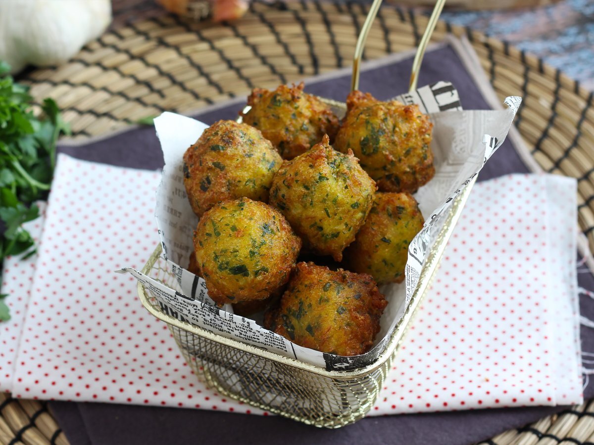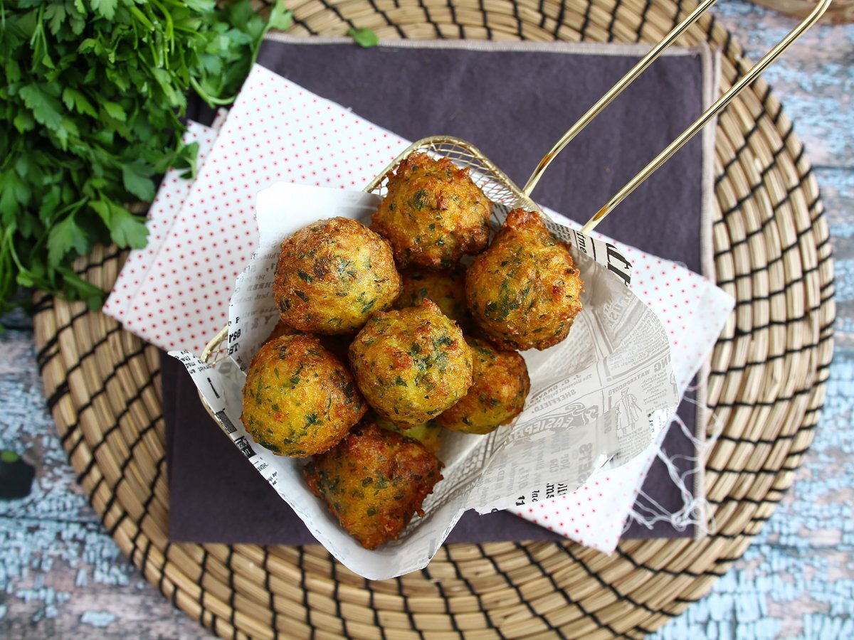 - Verser abondamment de l'huile d'olive (ou de friture classique) dans une grande sauteuse ou poêle à bords hauts et la faire chauffer. Lorsqu'elle est chaude, plonger des petites boules de pâte dedans. Vous pouvez les réaliser avec deux cuillères, comme des quenelles, ou les faire rouler dans vos mains légèrement graissées.