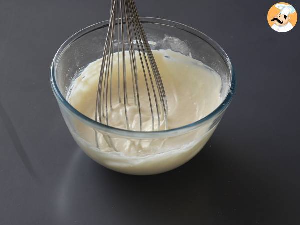Verser le yaourt grec dans un saladier et ajouter l'oeuf. Mélanger le tout. Ajouter ensuite la farine, la levure chimique et la pincée de sel.