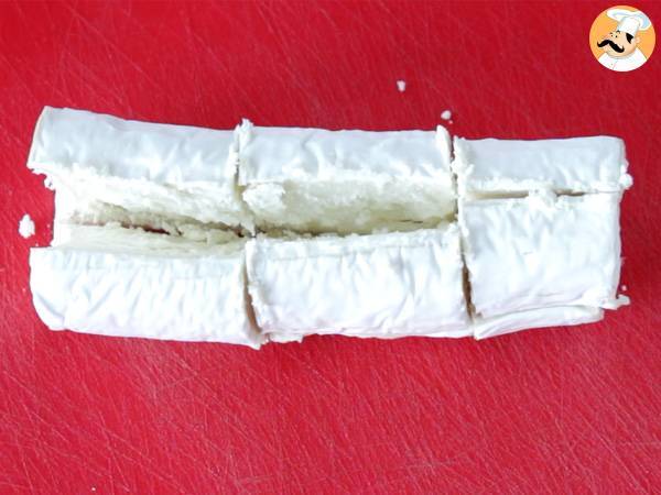 Coupez la bûche en 4 dans la longueur et en 3 dans la largeur, et mettez les morceaux au congélateur (cela évitera que le fromage fonde trop vite à la cuisson.)