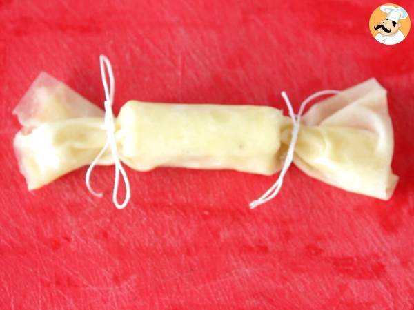 Roulez la feuille autour du chèvre, pincez les extrémités et faites des nœuds avec la ficelle.