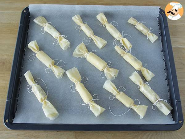 Attention, les feuilles filo ont tendance à sécher rapidement. Pendant que vous travaillez, mettez les feuilles non utilisées sous un torchon humide, et les emballer hermétiquement pour les conserver.