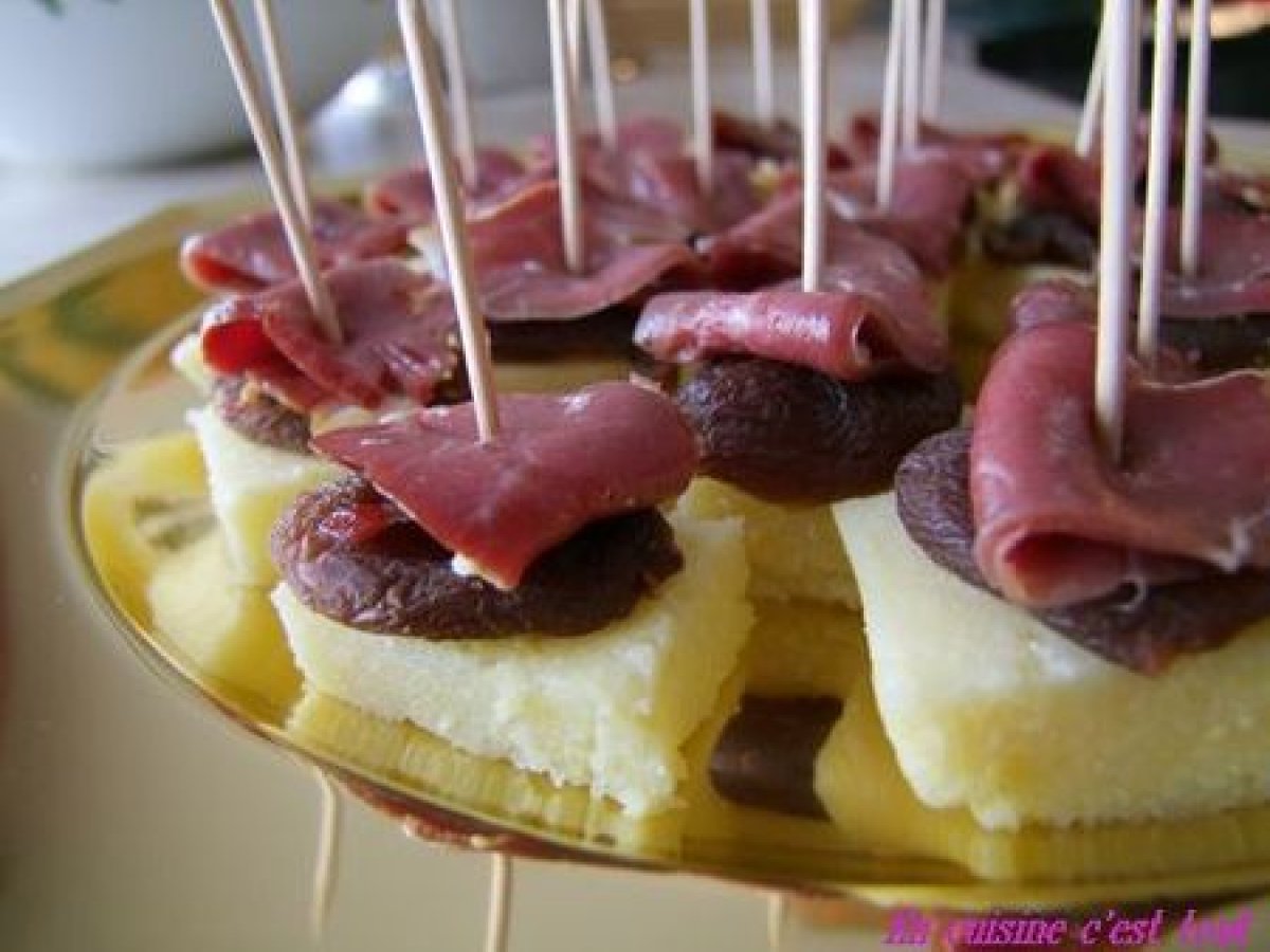 Bouchées de polenta aux abricots et au magret fumé - menu du réveillon de noël Apéritiffacile20 min161 Kcal Envoyer cette recette à un ami Imprimer cette page Poser une question à l'auteur Publier votre photo de cette recette Ingrédients 10 100 g de polenta précuite 200 ml d'eau 200 ml de lait 50 g de parmesan râpé Sel 15 abricots secs 30 lamelles de magret fumé