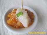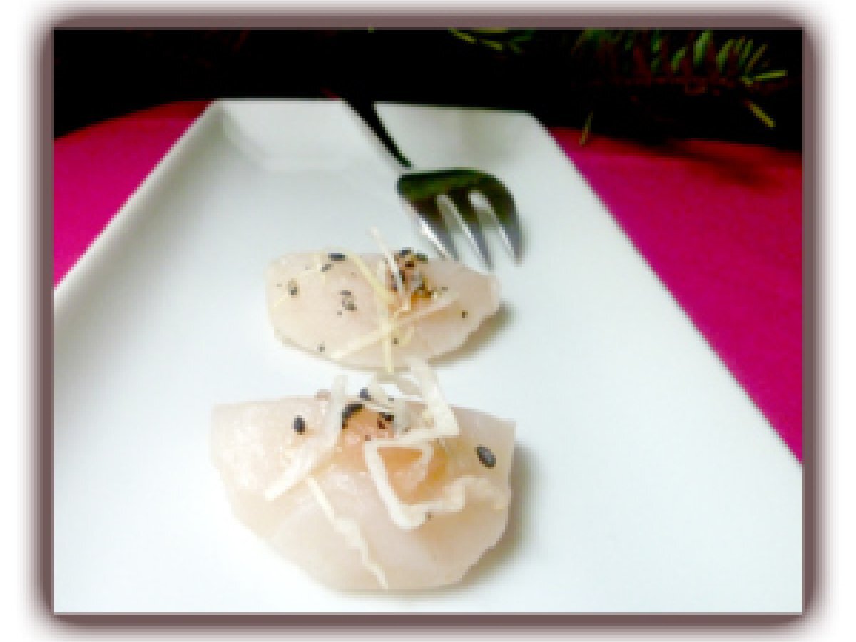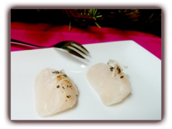 Bouchées de saint jacques confites au sel, sésame et gingembre. votez maintenant PrécédentSuivant Apéritiffacile10 min211 Kcal Envoyer cette recette à un ami Imprimer cette page Poser une question à l'auteur Publier votre photo de cette recette Ingrédients 4 4 grosses coquilles Saint Jacques 3 cuillères à soupe de gingembre au vinaigre mariné 3 cuillères à soupe d’huile neutre 1 cuillère à soupe d’huile de sésame 1 cuillère à soupe de Nuoc Mam 3 cuillères à soupe de vinaigre de riz 3 cuillères à soupe de sucre 1 cuillère à café de cumin moulin 1/2 citron jaune 25 cl d’eau claire une feuille de salade amère Coût estimé: 4.29Euros€ (1.07€/part)