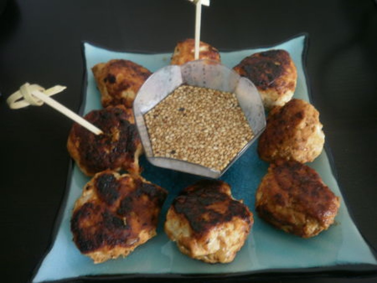 Boulettes de poulet à la sauce soja. Apéritiffacile15 min177 Kcal Envoyer cette recette à un ami Imprimer cette page Poser une question à l'auteur Publier votre photo de cette recette Ingrédients 4 3 blancs de poulet 1 Cuillère à soupe d'huile 2 échalotes finement émincées 1/2 branche de céleri émincée 2 Cuillères à soupe de sauce soja claire 1 gousse d'ail hachée 1 oeuf 1 oignon émincé sel poivre pour la sauce: 3 cuillères à soupe de sauce soja 1 Cuillère à soupe de vinaigre de riz 1 cuillère à café de graines de sésame Coût estimé: 5.07Euros€ (1.27€/part)