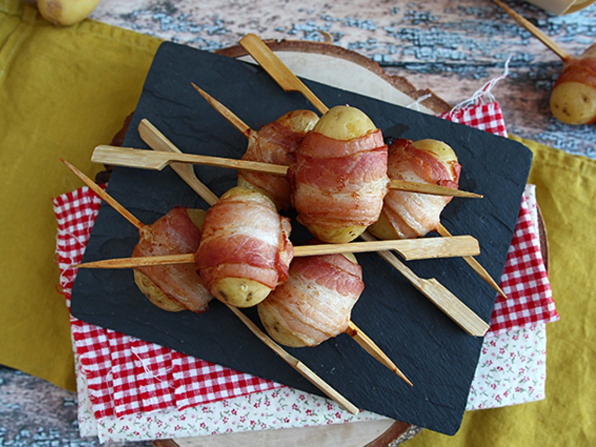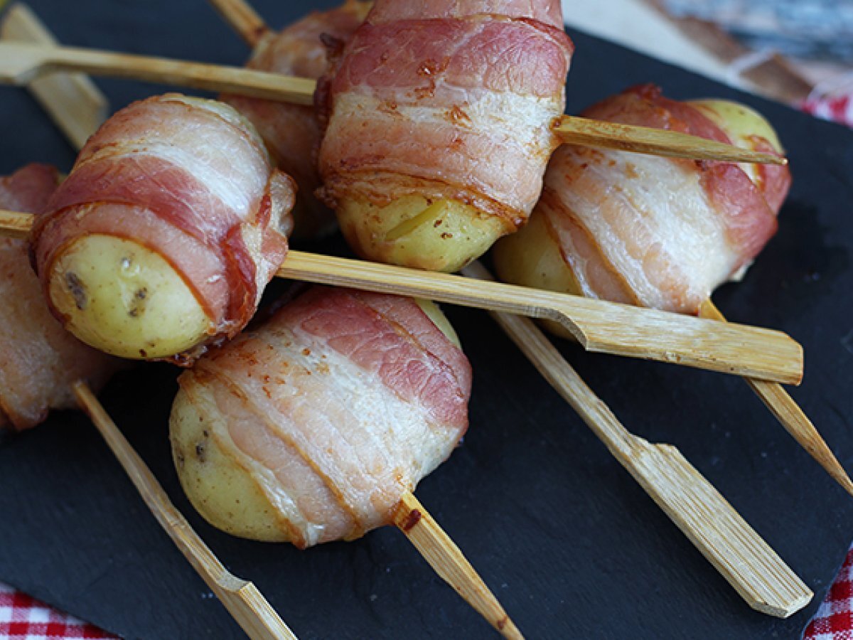Brochettes apéritives de pommes de terre et poitrine fumée