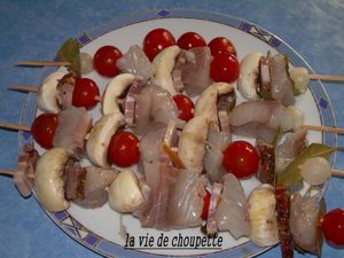 Brochettes de lieu et légumes votez maintenant PrécédentSuivant Apéritiffacile40 min Envoyer cette recette à un ami Imprimer cette page Poser une question à l'auteur Publier votre photo de cette recette Ingrédients 4 Brochettes de légumes : 1 courgette 1 aubergine 1/2 poivron rouge et vert champignons de Paris frais de l'huile, le jus d'un demi-citron 1 gousse d'ail du thym sel et poivre Brochettes de lieu : 200 g de lieu tomates cerises quelques petits oignons champignons de Paris frais 2 tranches de lard feuilles de laurier sel poivre et huile d'olive