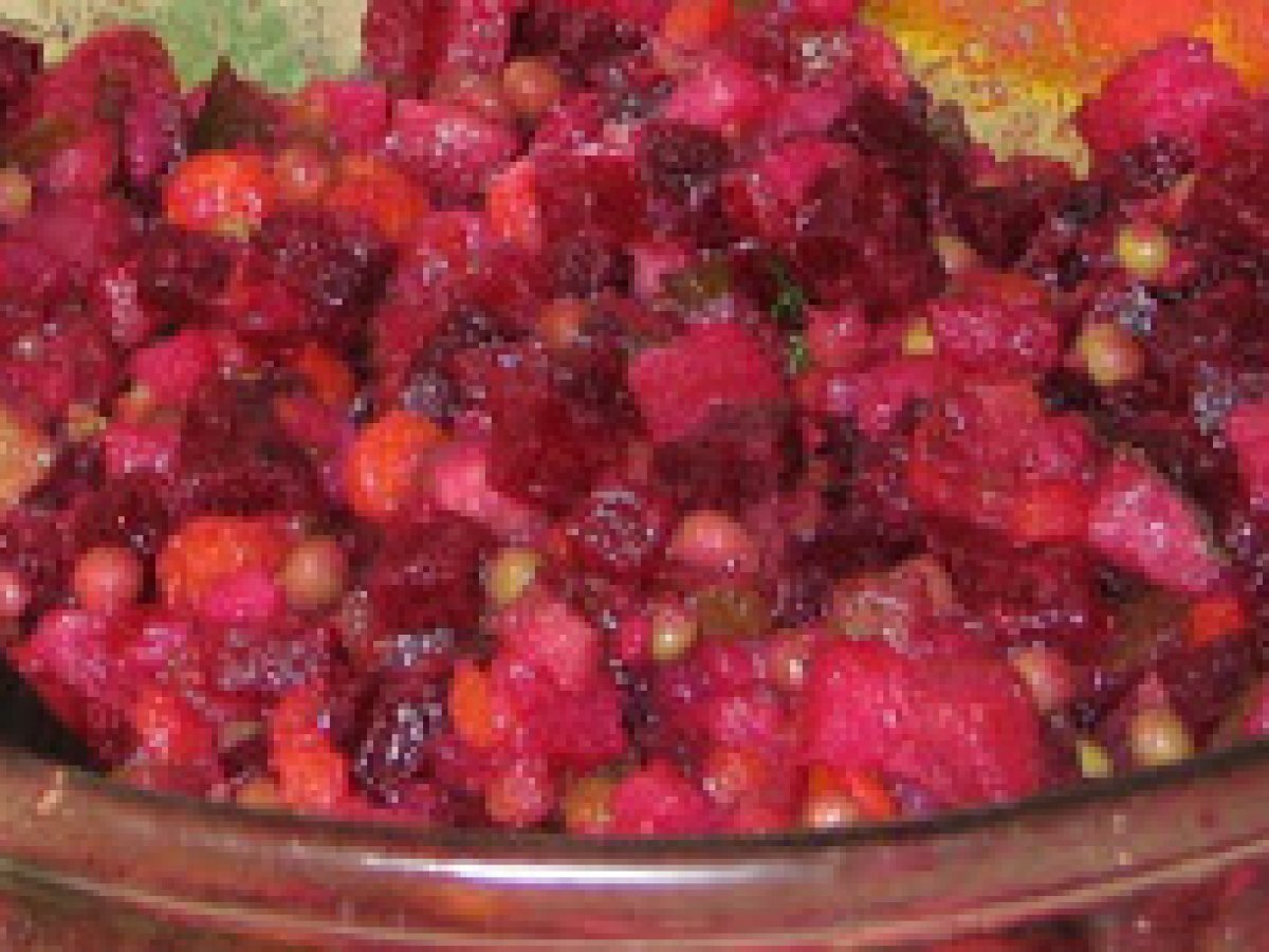 Coupez-les en petits cubes(7mm), et disposez-les dans un saladier. - Ouvrez délicatement le sachet de betteraves, versez le jus sur les pommes de terre et mélangez. Coupez les betteraves en cubes de la même taille que les pommes de terre, et mélangez.
