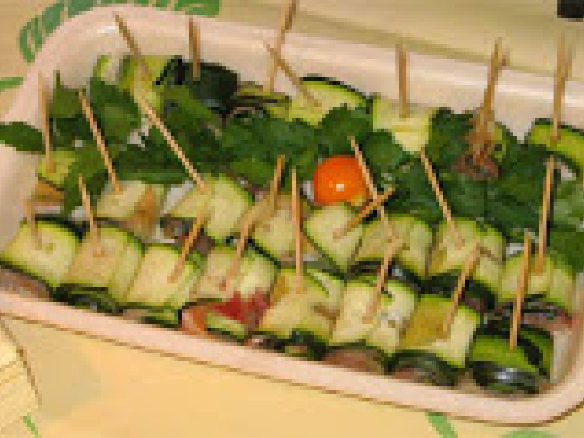 - 2) Avec un économe, prélevez de longues lamelles de courgettes (arretez vous aux pépins). Sur chaque lamelle mettez un trait de pesto et ajoutez une lamelle fine de jambon.