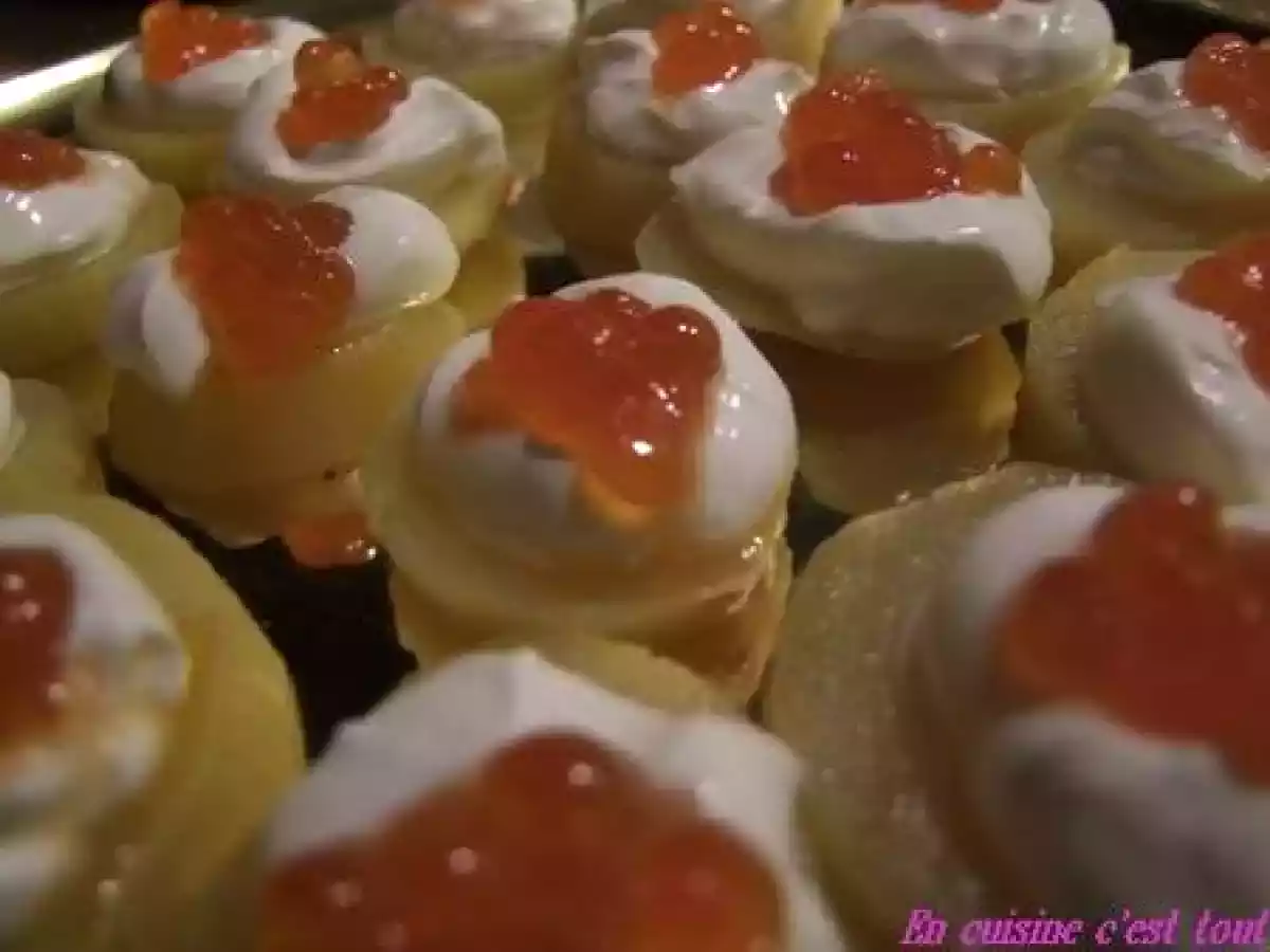 Canapés de pommes-de-terre aux oeufs de saumon Apéritiffacile25 min Envoyer cette recette à un ami Imprimer cette page Poser une question à l'auteur Publier votre photo de cette recette Ingrédients 6 500 g de pommes de terre fermes 1 pot de crème épaisse 1 pot d'oeufs de saumon
