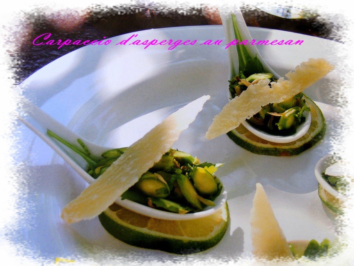Carpaccio d'asperge en petites cuillières votez maintenant Apéritiffacile15 min Envoyer cette recette à un ami Imprimer cette page Poser une question à l'auteur Publier votre photo de cette recette Ingrédients 4 5 asperges vertes 2 citrons verts Feuilles de coriandre Quelques feuilles de roquette 4 languettes de parmesan Huile d'olive Fleur de sel Poivre