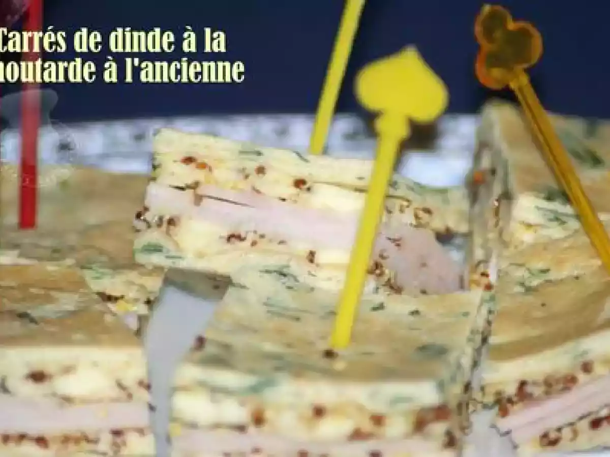 Carrés de dinde à l'estragon et moutarde à l'ancienne votez maintenant PrécédentSuivant Apéritiffacile23 min358 Kcal Envoyer cette recette à un ami Imprimer cette page Poser une question à l'auteur Publier votre photo de cette recette Ingrédients 6 2 blancs d'oeufs 5 g de sucre 2 oeufs avec 1 pincée de sel 30 g de fécule de pomme de terre 15 g d'estragon 30 g de fécule 10 g de beurre 150 g de beurre mou fouetté 130 g de moutarde à l'ancienne 1 cuillère à soupe de moutarde de Dijon 200 g de tranches de dinde fumée Coût estimé: 5.75Euros€ (0.96€/part)