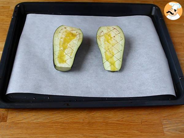 • Caviar d'aubergine facile - Préparation etape 1Couper l'aubergine en deux dans le sens de la longueur. Inciser la chair et verser un filet d'huile d'olive.