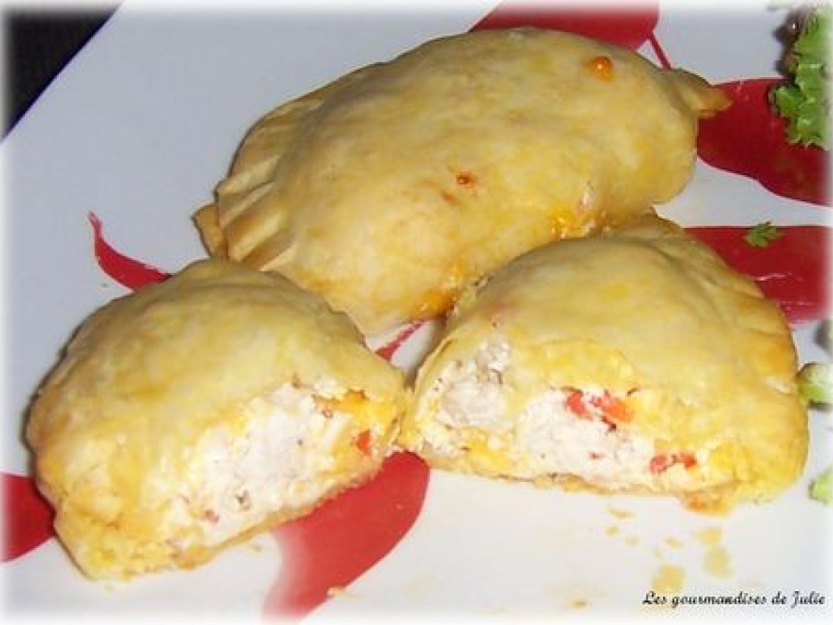 Chaussons poulet, poivron, ricotta Apéritifmoyen30 min391 Kcal Envoyer cette recette à un ami Imprimer cette page Poser une question à l'auteur Publier votre photo de cette recette Ingrédients 4 1 rouleau de pâte feuilletée 1 blanc de poulet cuit, coupé en cubes 125 g de ricotta 1 oeuf 1 poivron rouge sel, poivre un peu de basilic haché Coût estimé: 3.68Euros€ (0.92€/part)
