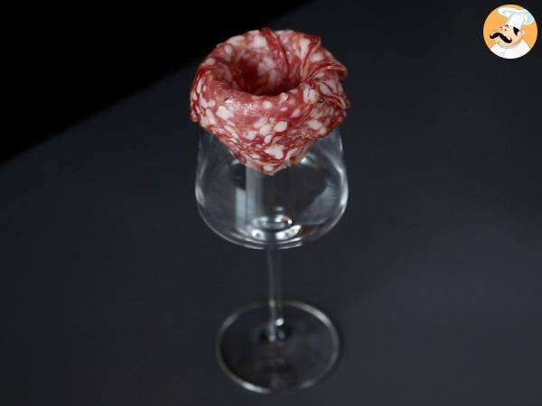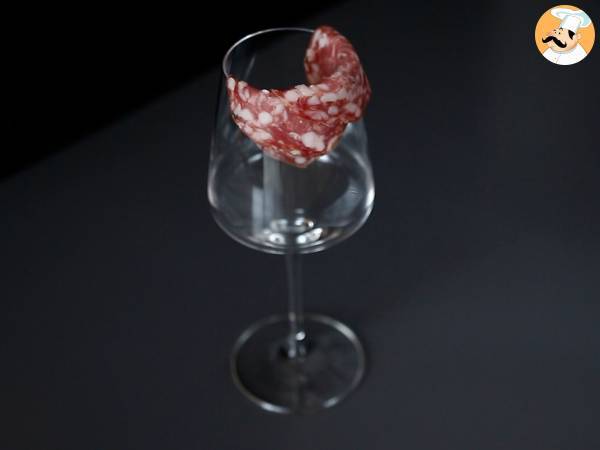Plier une tranche de rosette en deux sur le bord du verre. Ajouter une tranche par dessus mais en la décalant sur le côté, au niveau de la moitié de la première.