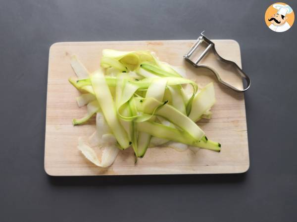 Laver les courgettes et les couper très finement à l'aide d'une mandoline ou d'un éplucheur à légumes.