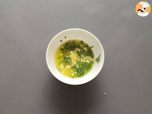 Hacher les feuilles de menthe et l'ail (en très petits morceaux) avec un couteau. Les ajouter ensuite à la marinade, assaisonner de sel et de poivre et bien mélanger.