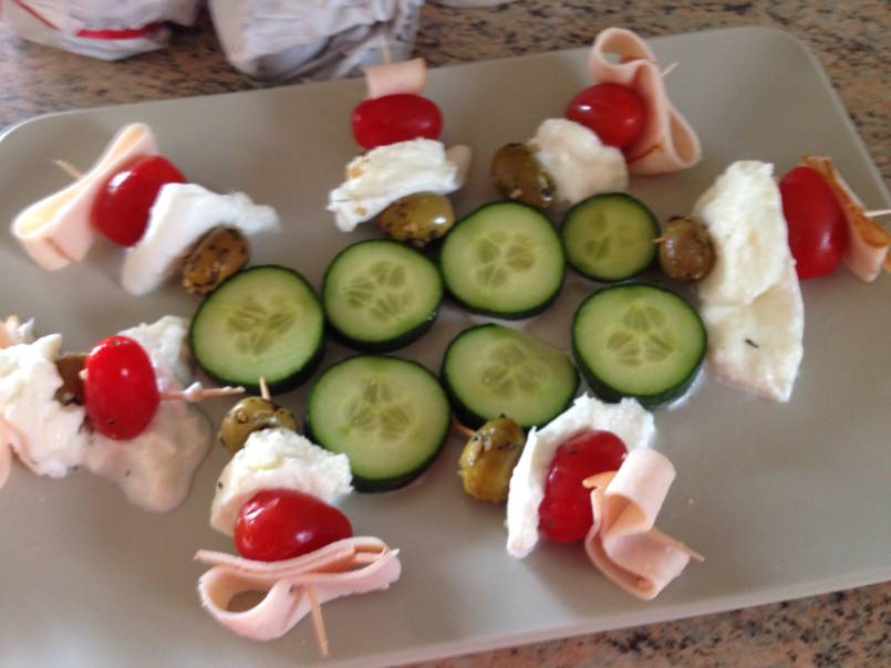 - Former les brochettes : piquer les ingrédients sur les brochettes en piquant toujours la tomate en premier.