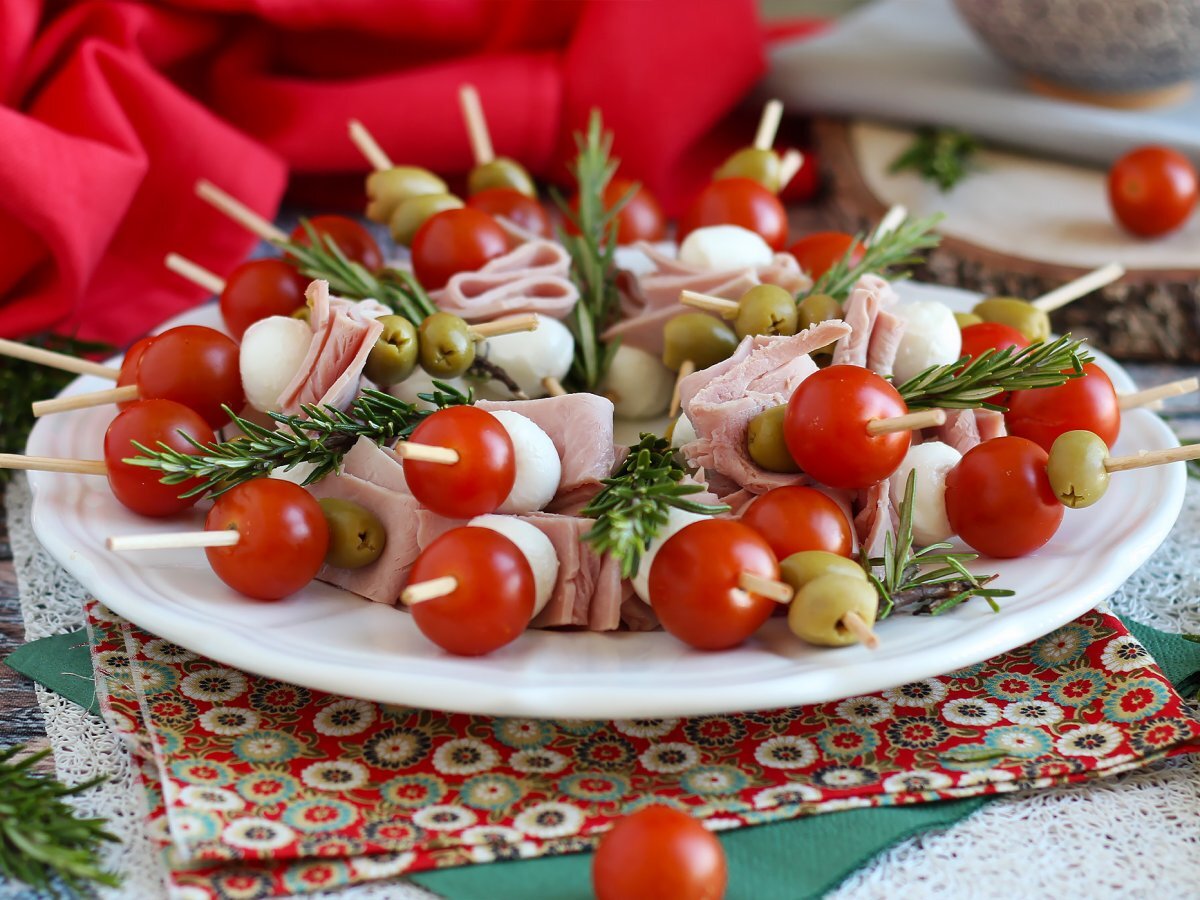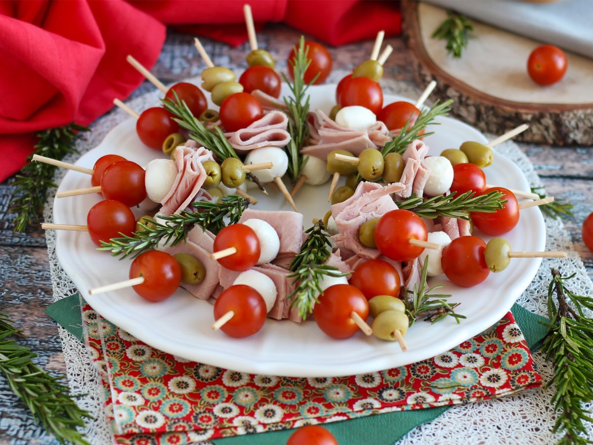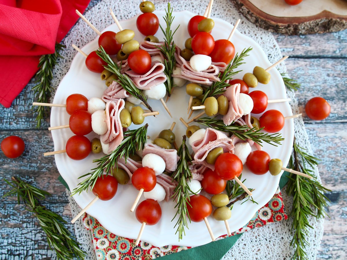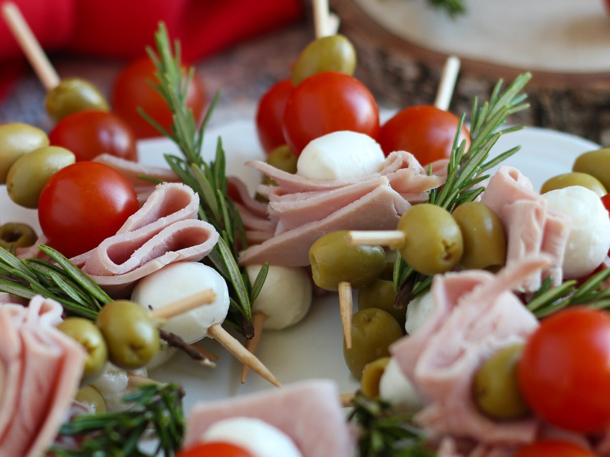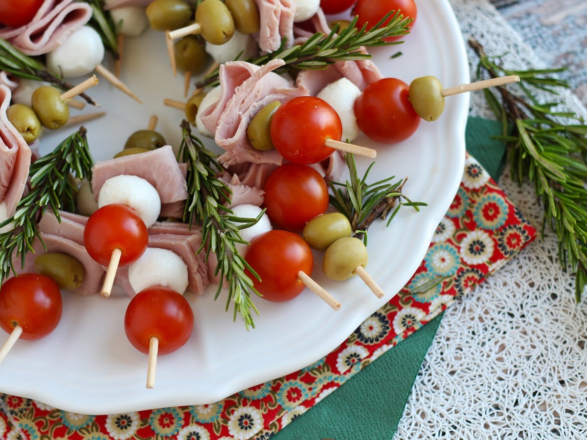 Vous aurez besoin de 20 tomates cerises, 150 gr de billes de mozzarella, 160 gr d'olives vertes, 30 gr de romarin frais et 4 tranches de jambon.