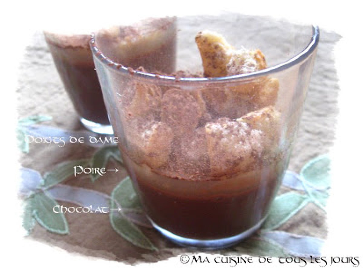 Crème prise choco-café, pulpe de poire et doigts de dame cassés