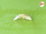 Placez une crevette d'un côté de la feuille filo et enroulez-la jusqu'à l'autre côté. Laissez dépasser un morceau de crevette.