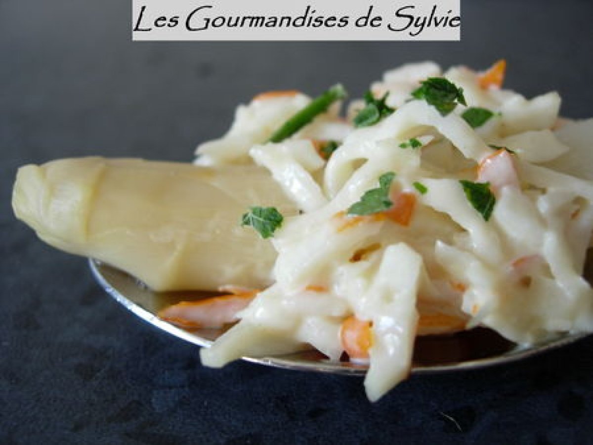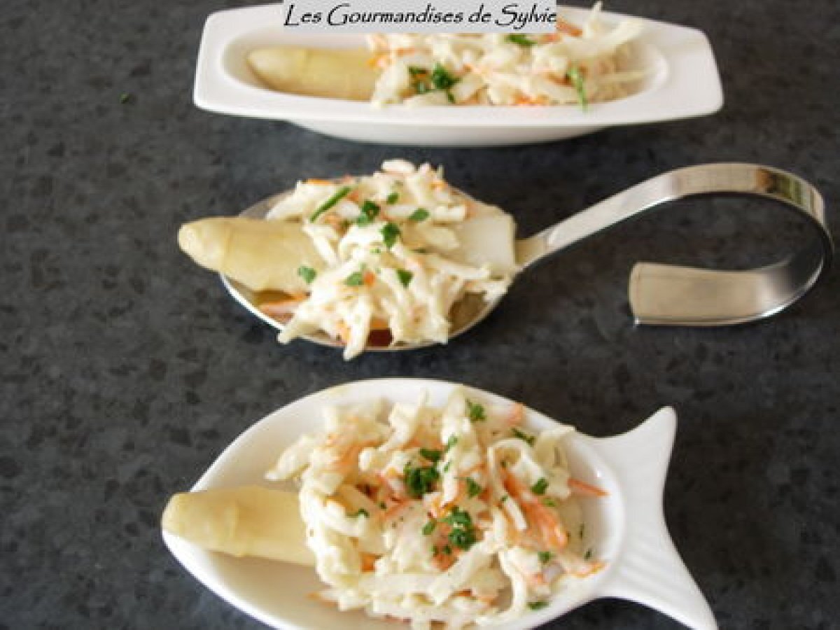 Voici une mise en bouche en petites cuillères, simple, rapide à réaliser, où la chair de crabe et les pointes d'asperges s'unissent en douceur et à merveille !