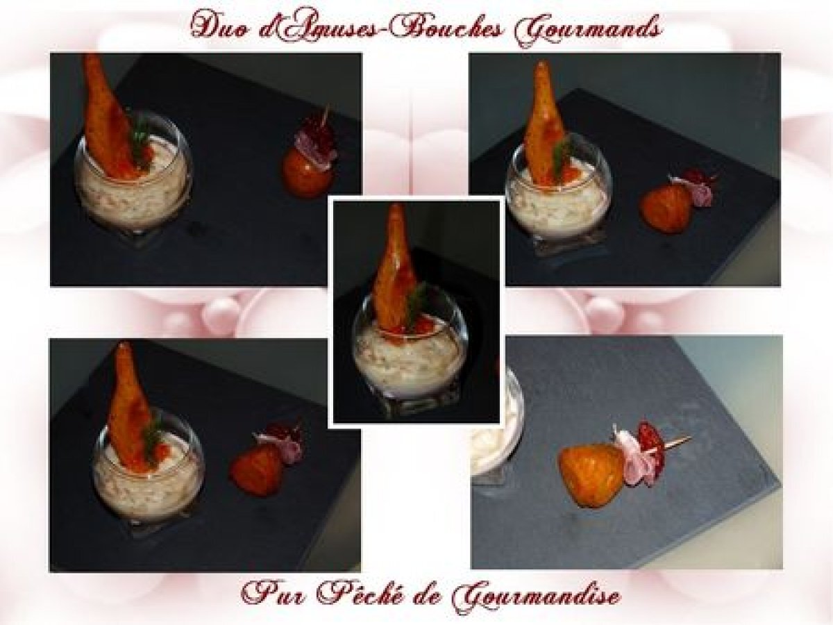 Duo d'amuses-bouches gourmands votez maintenant Apéritiffacile42 min Envoyer cette recette à un ami Imprimer cette page Poser une question à l'auteur Publier votre photo de cette recette Ingrédients 15 Les moelleux de Provence : 20 g d'huile d'olive 60 g de confit de tomates séchées 5 g de sucre glace 4 g d'ail déshydraté 2 petits oeufs 80 g de farine T55 3 g de levure chimique 7 g de purée de basilic (trouvé au rayon des sauces en grande surface) 12 tranches de jambon de Bayonne 8 tomates confites piment d'Espelette la crème de tarama : 50 g de crème fraîche liquide 180 g de tarama La salade de crabe : 5 g de moutarde de Dijon 1 jaune d’oeuf 80 g d'huile de pépins de raisin 1 petit suisse Piment de Cayenne 1 botte d'aneth ciselé 350 g de chair de crabe 1 pamplemousse oeufs de truite Les cuillères de surimi : 10 g d'huile d'olive 1 gros oeuf 2 gouttes de Tabasco 50 g de caviar de tomates ou poivron rouge 50 g de miettes de surimi 60 g de farine T55 3 g de levure chimique 20 g de miettes de surimi