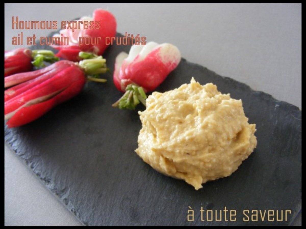 Houmous express maison sauce pour légumes crus à l'apéritif Apéritiffacile5 min Envoyer cette recette à un ami Imprimer cette page Poser une question à l'auteur Publier votre photo de cette recette Ingrédients 4 500 g de pois chiches en boîte le jus de 1 citrons frais 1 verre d'huile d'olive 2 grosses gousses d'ail ½ cuillère à soupe de cumin 2 cuillères à soupe de Tahin
