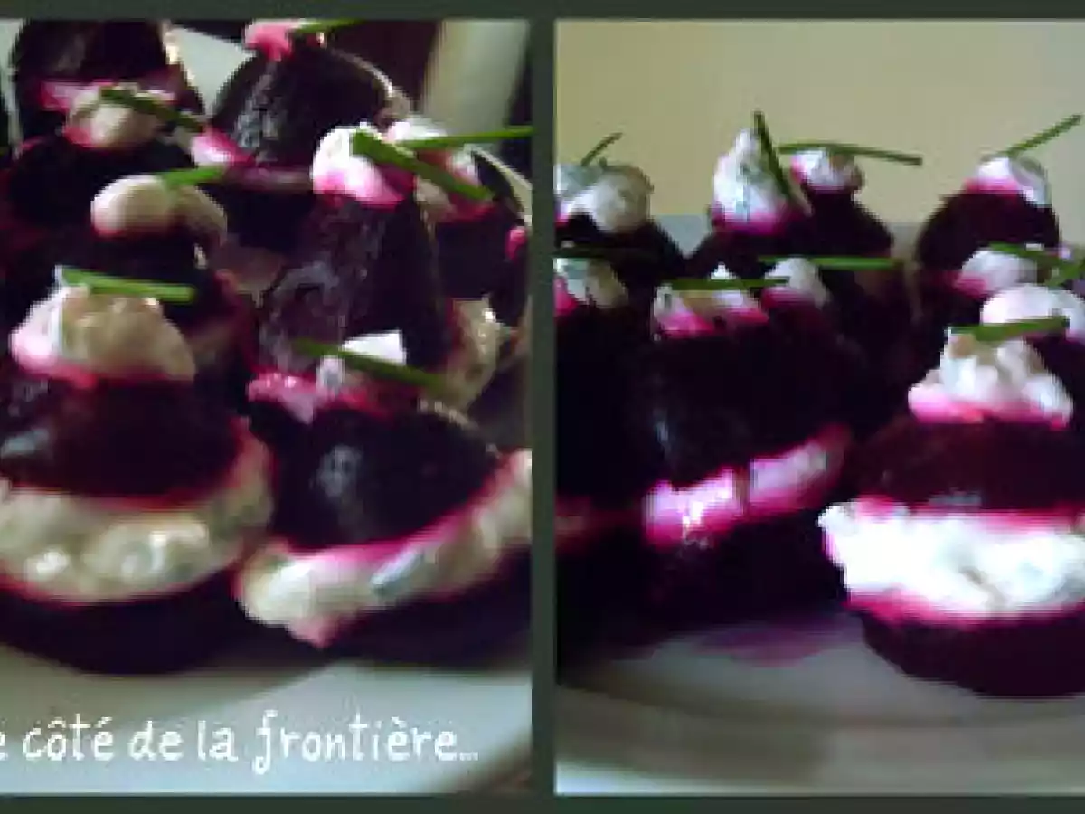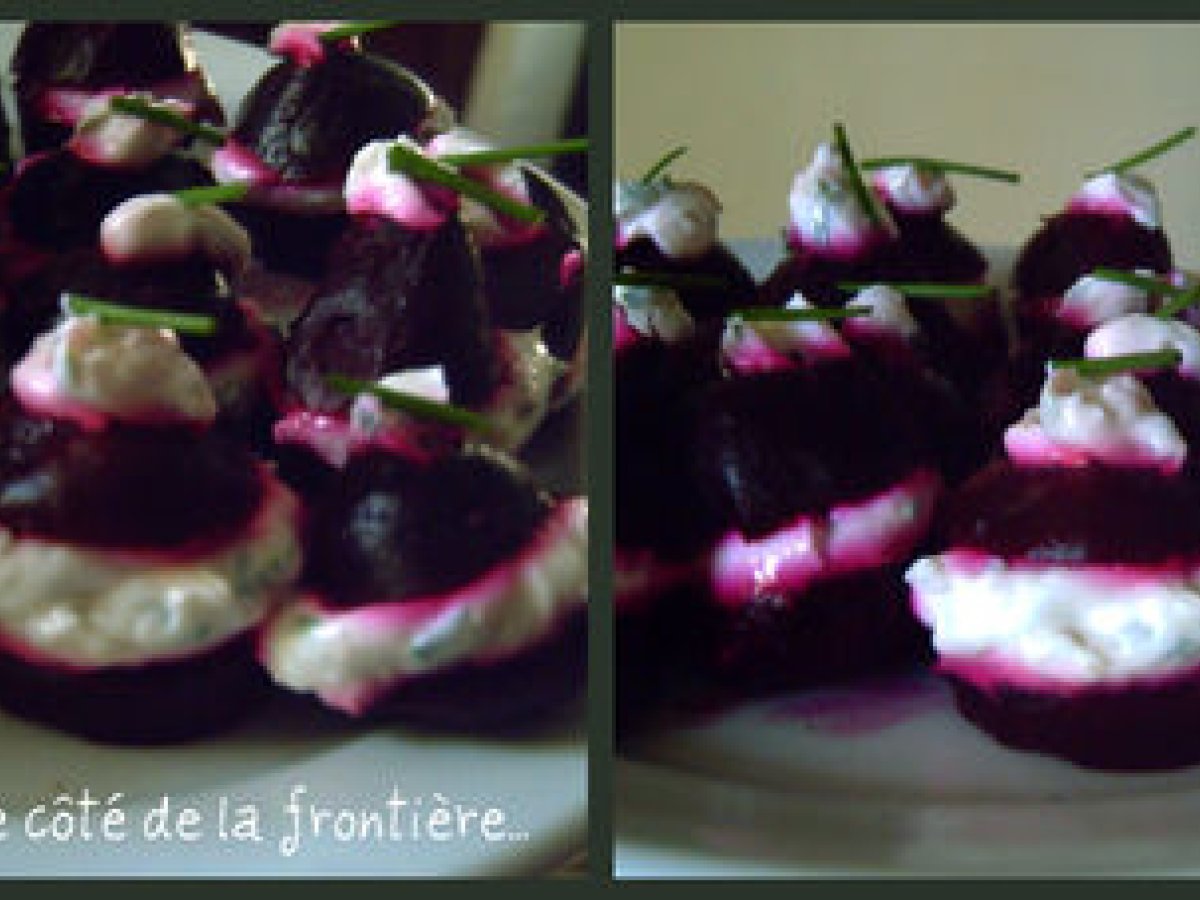 Mini-betteraves farcies au fromage frais votez maintenant Apéritiffacile15 min229 Kcal Envoyer cette recette à un ami Imprimer cette page Poser une question à l'auteur Publier votre photo de cette recette Ingrédients 10 Environ 20 mini-betteraves ½ boîte de fromage frais Ciboulette 1 gousse d?ail haché finement. Sel, poivre