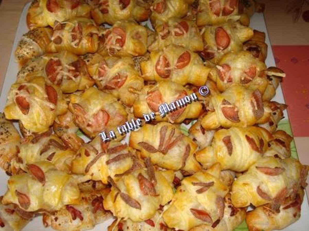 Mini croissants knacks ou jambon Apéritiffacile1 h 5 m Envoyer cette recette à un ami Imprimer cette page Poser une question à l'auteur Publier votre photo de cette recette Ingrédients 15 2 pâtes feuilletées, 2 cuillères à café de moutarde au cassis 200 g de knacks 80 g de gruyère Décoration : oeuf battu, knack, gruyère Mini croissants au jambon: 1 pâte feuilletée 2,5 cuillères à soupe de fromage blanc 2 cuillères à café de chapelure 80 g de jambon blanc coupé en petits cubes 1 cuillère à soupe de persil haché Ail, sel, poivre du moulin Décoration : oeuf battu, graine de courge, pavot