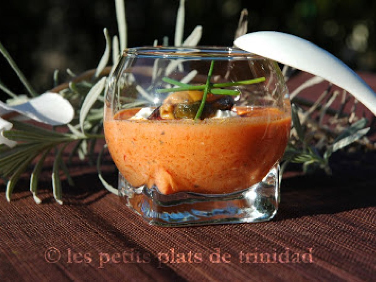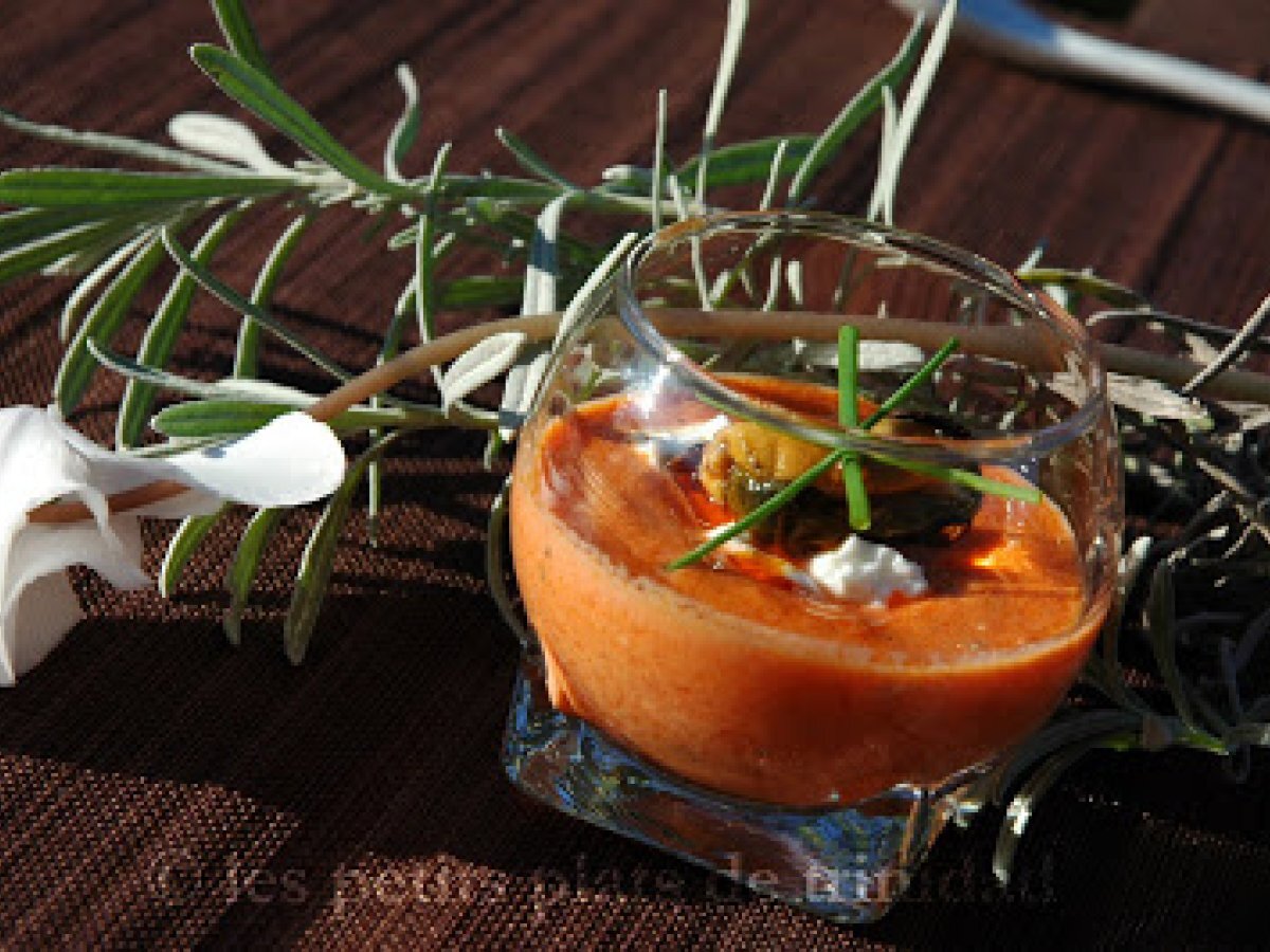 Mini verrine de crème de poivrons, larme de chavroux, moule en escabèche