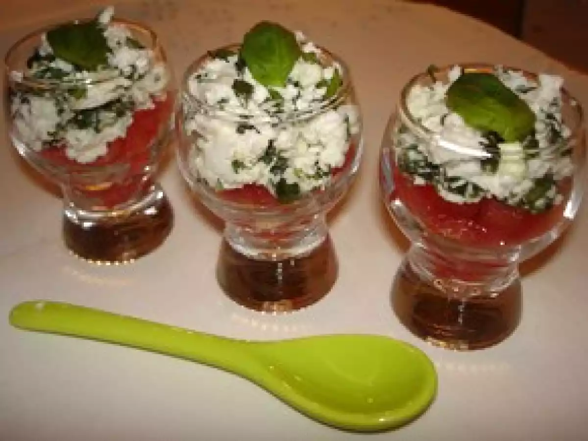 - Répartissez dans les verrines, les dés de tomate dans le fond, puis ajoutez le chèvre au basilic.