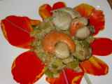 Noix de st jacques snackées sur lit de poivron/pomme/gingembre et lentille/ananas