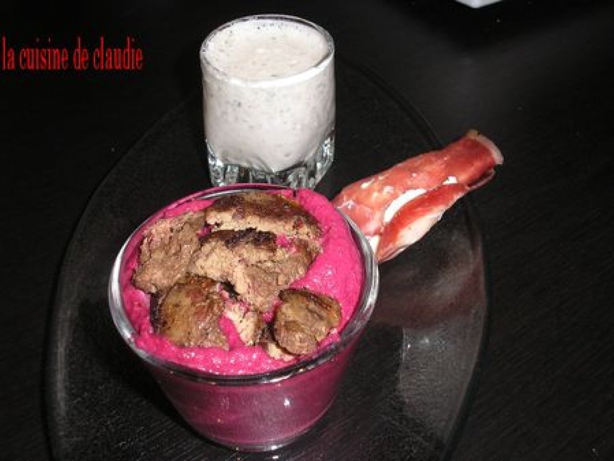Panna cotta aux champignons, coppa au fromage et mousse de betterave aux foies votez maintenant PrécédentSuivant Apéritiffacile25 min284 Kcal Envoyer cette recette à un ami Imprimer cette page Poser une question à l'auteur Publier votre photo de cette recette Ingrédients 3 INGRÉDIENTS pour 3 petites verrines: 6 champignons de paris persil sel 7,5 cl de lait 7,5 cl de crème 2 feuilles de gélatine 1 pincée de curry Pour la coppa au fromage: 100 g de saint moret 4 noix herbes de provence 2 tranches de coppa