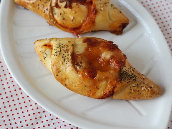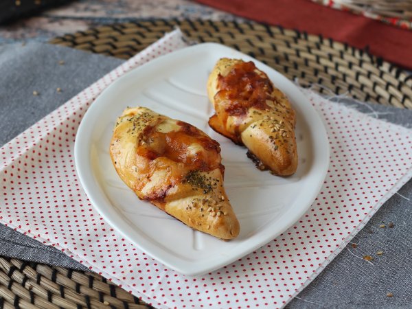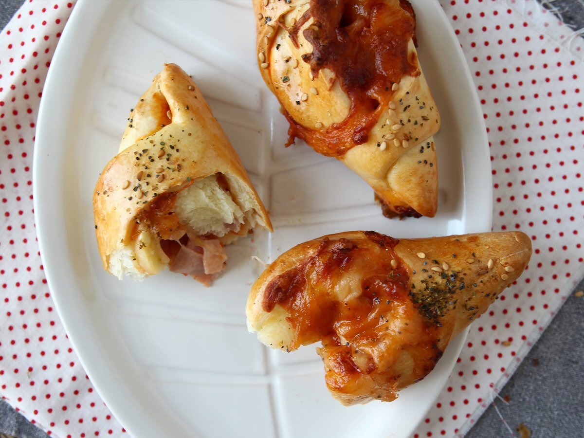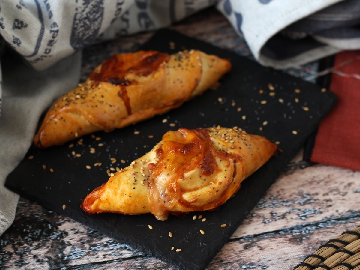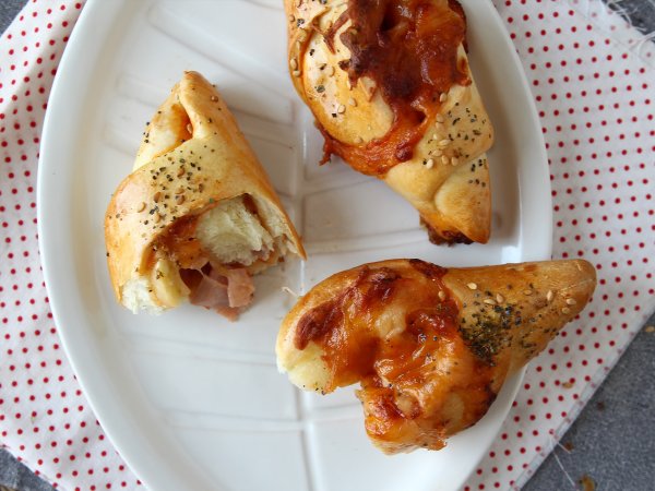 Petits pains bateaux façon pizza farcis de sauce tomate, jambon et mozzarella