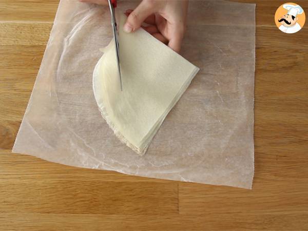Superposez les feuilles de brick et coupez les en 4 quarts. Superposez-les, et coupez les bords arrondis afin de former des triangles.