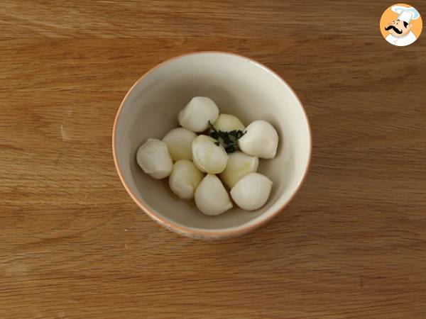 Dans un bol, mettez les billes de mozzarella, ajoutez un peu d'huile d'olive et du basilic ciselé. mélangez bien.