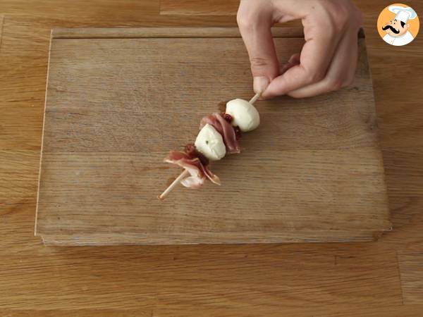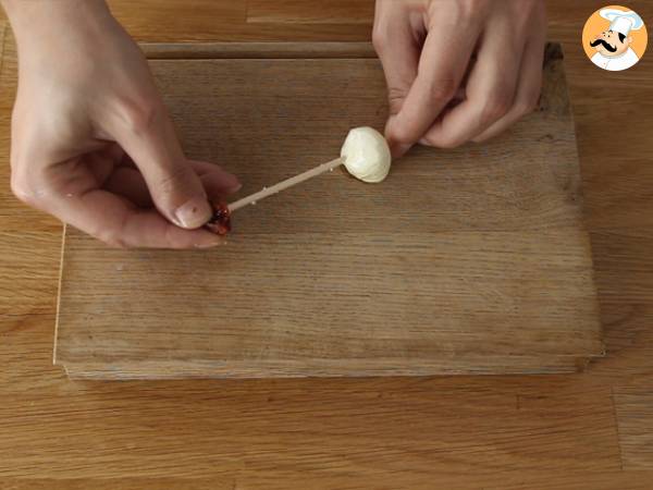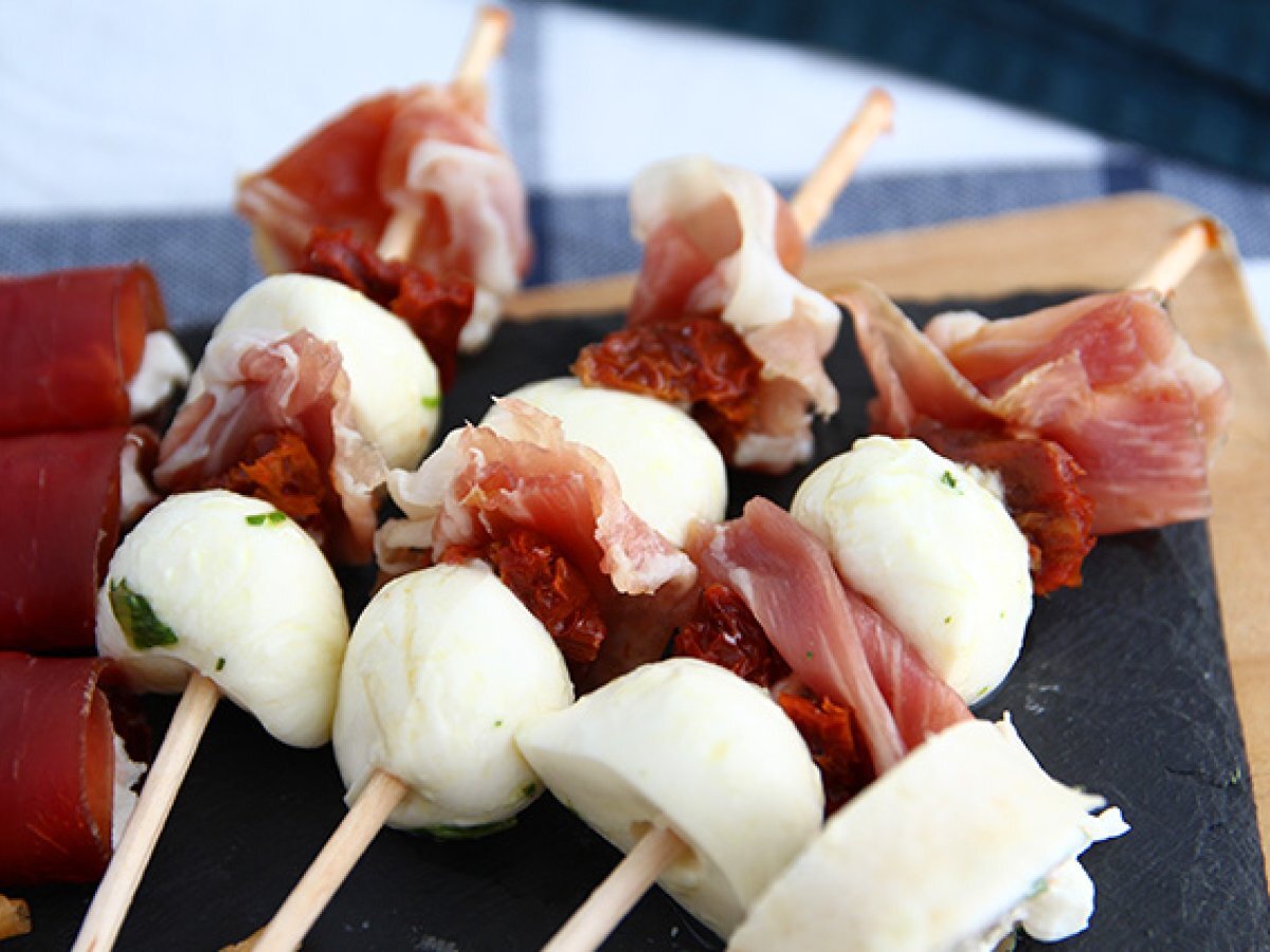 Piquez une bille sur une brochette. Ajoutez un morceaux de jambon cru, et un morceau de tomate séchée.