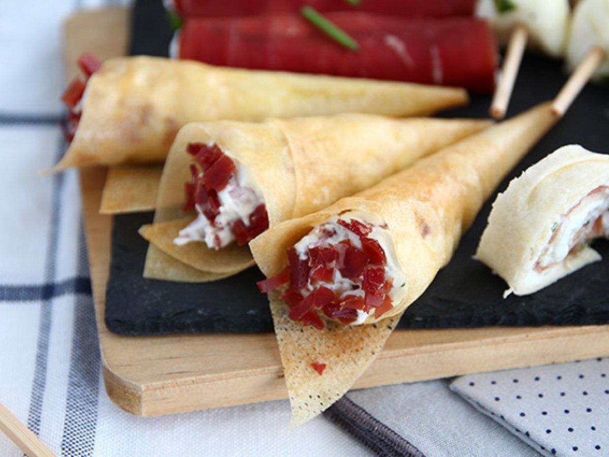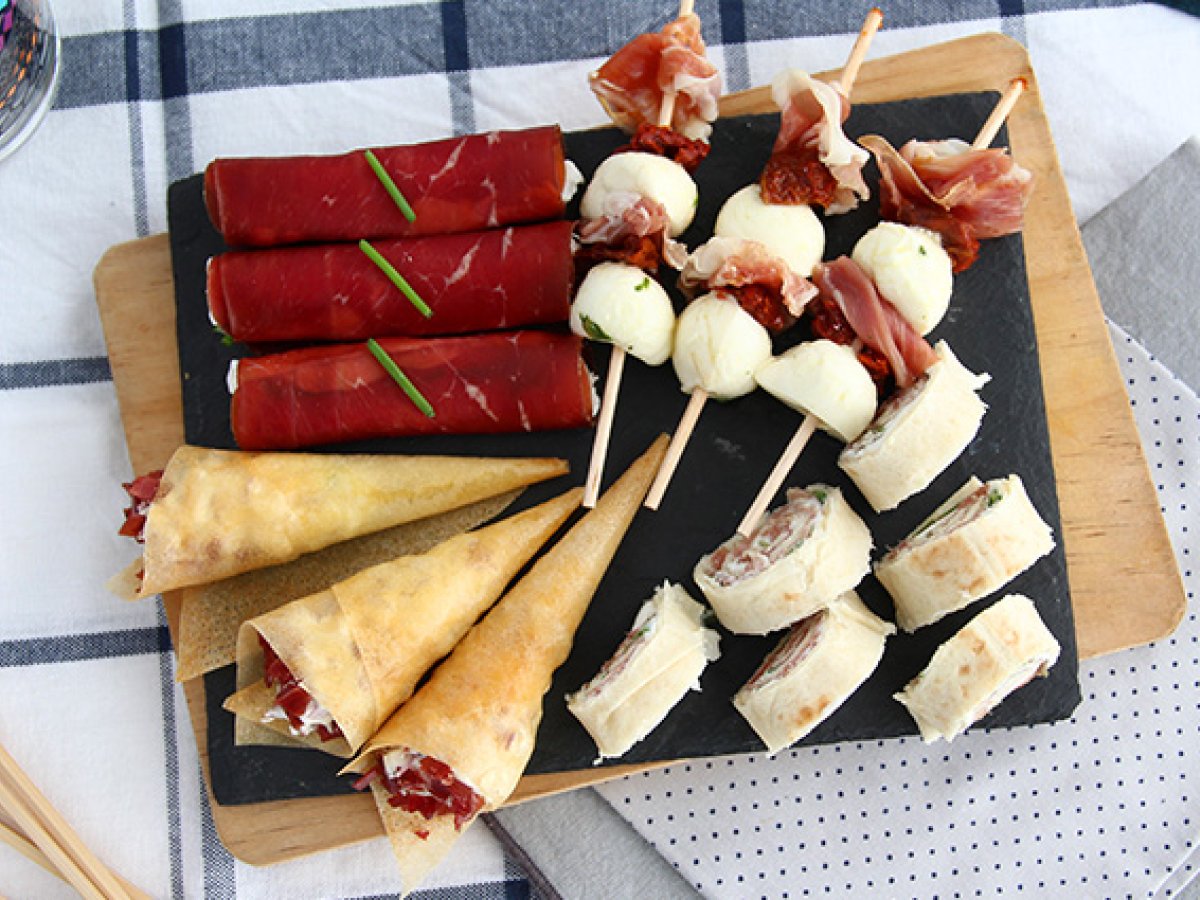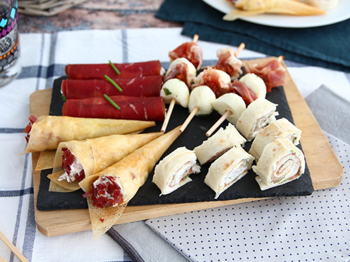 Le fait maison est de rigueur pour un apéritif encore meilleur ! Ici on vous propose 4 recettes ultra faciles à faire avec de la viande séchée. Utilisez tantôt de la viande des grisons, tantôt du jambon cru afin d'apporter la petite touche salée qui fera toute la différence dans cet apéritif. 3 recettes seront sans cuisson : des wraps, des brochettes et des roulés. Pour la dernière, la feuille de brick cuite sous la forme de cône viendra vous faire croustiller de plaisir accompagnée d'une garniture au fromage frais :-) Suivez pas à pas les étapes de réalisation de ces 4 idées festives et n'hésitez pas à nous dire en commentaire laquelle est votre préférée :-)