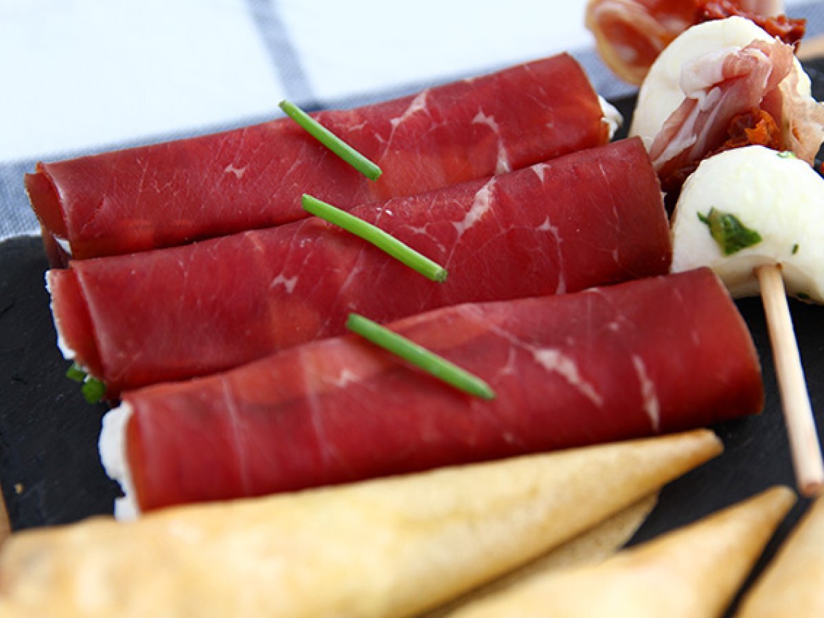 Des dips comme du houmous ou du tzatziki, ainsi que des crudités, se marient parfaitement avec ces apéritifs à la viande séchée.