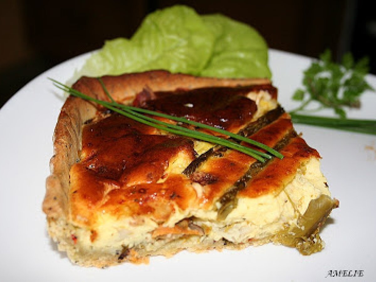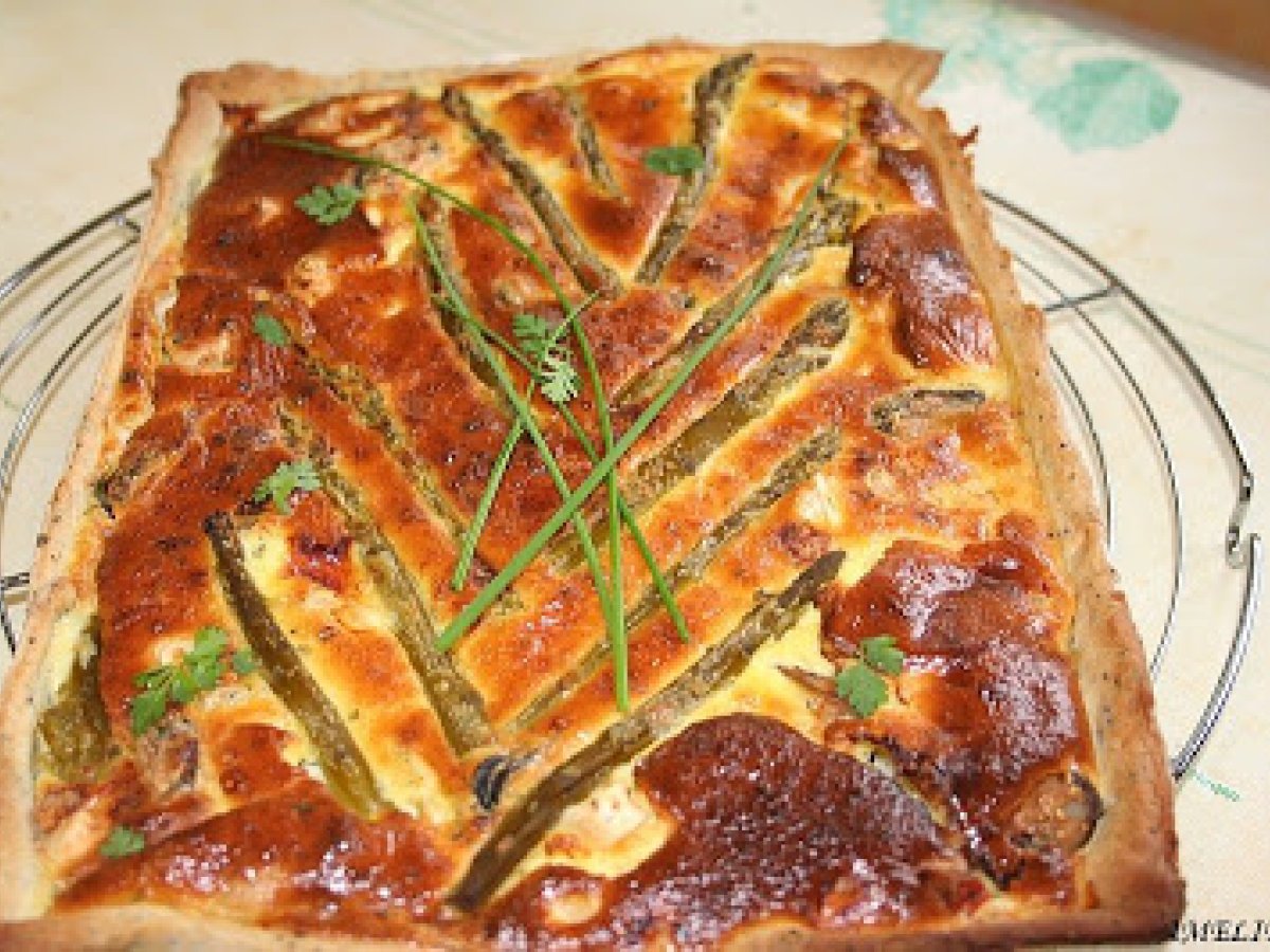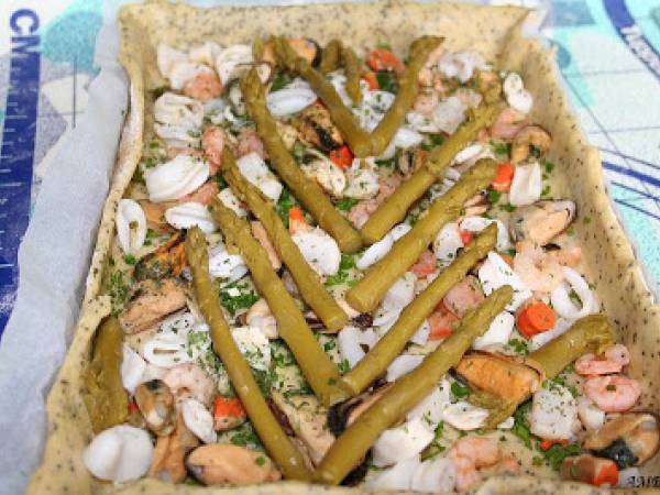 Quiche aux fruits de mer et asperges vertes PrécédentSuivant Apéritifmoyen1 heure Envoyer cette recette à un ami Imprimer cette page Poser une question à l'auteur Publier votre photo de cette recette Super bon la recette Ingrédients 4 Pâte brisée: 250 g de farine 100 g de beurre 1 oeuf 1 pincée de sel 8 c à s d'eau froide (environ) 2 à 3 c de pavot (pour moi 3) Garniture: 300 g de fruits de mer surgelés (moules, crevettes, encornets, pétoncles) ½ sachet de court-bouillon déshydraté 100 g d'asperges vertes précuites, ou en conserve. Curry, sel poivre et muscade Une petite botte de ciboulette 3 oeufs 250 g de fromage blanc battu 200 g de crème épaisse 1 c à s de maïzena (les fruits de mer et les asperges, lâchent de l?eau) Un peu de parmesan râpé si vous aimez (facultatif)