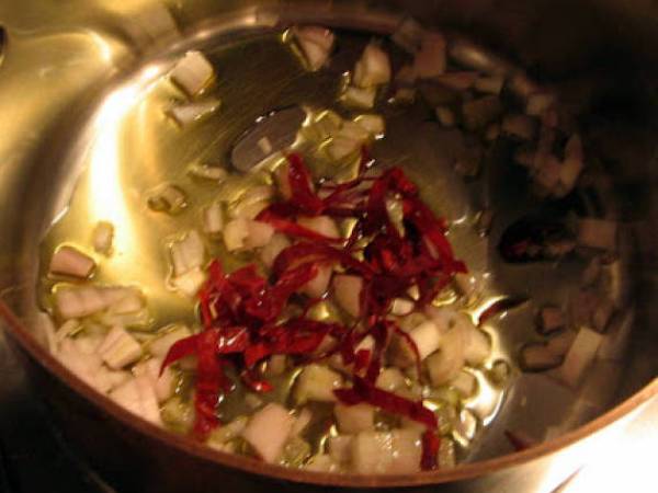 Faites suer quelques échalotes et de l’Espelette fraîche ( à défaut séchée) dans l'huile d'olive.