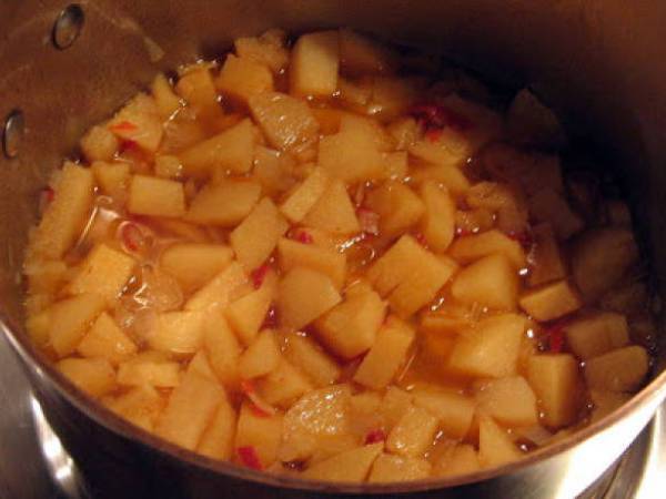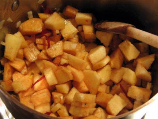 Epluchez les coings et coupez les en petits morceaux et ajoutez les aux échalotes. Remuez bien, assaisonnez avec du sel,un peu de poivre, du sucre et déglacez avec le balsamico bianco et un peu de porto blanc.