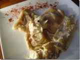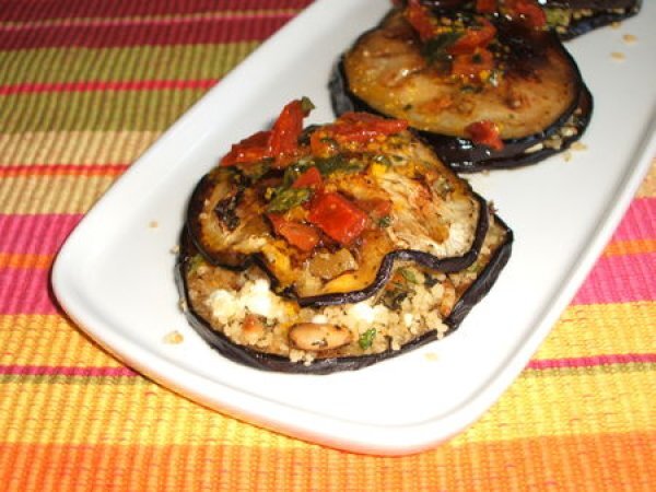 Ravioles d'aubergines farcies à l'orientale, sauce aux agrumes et aux tomates séchées