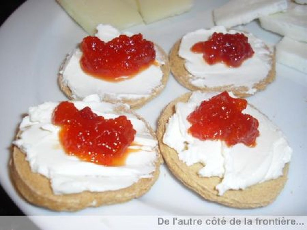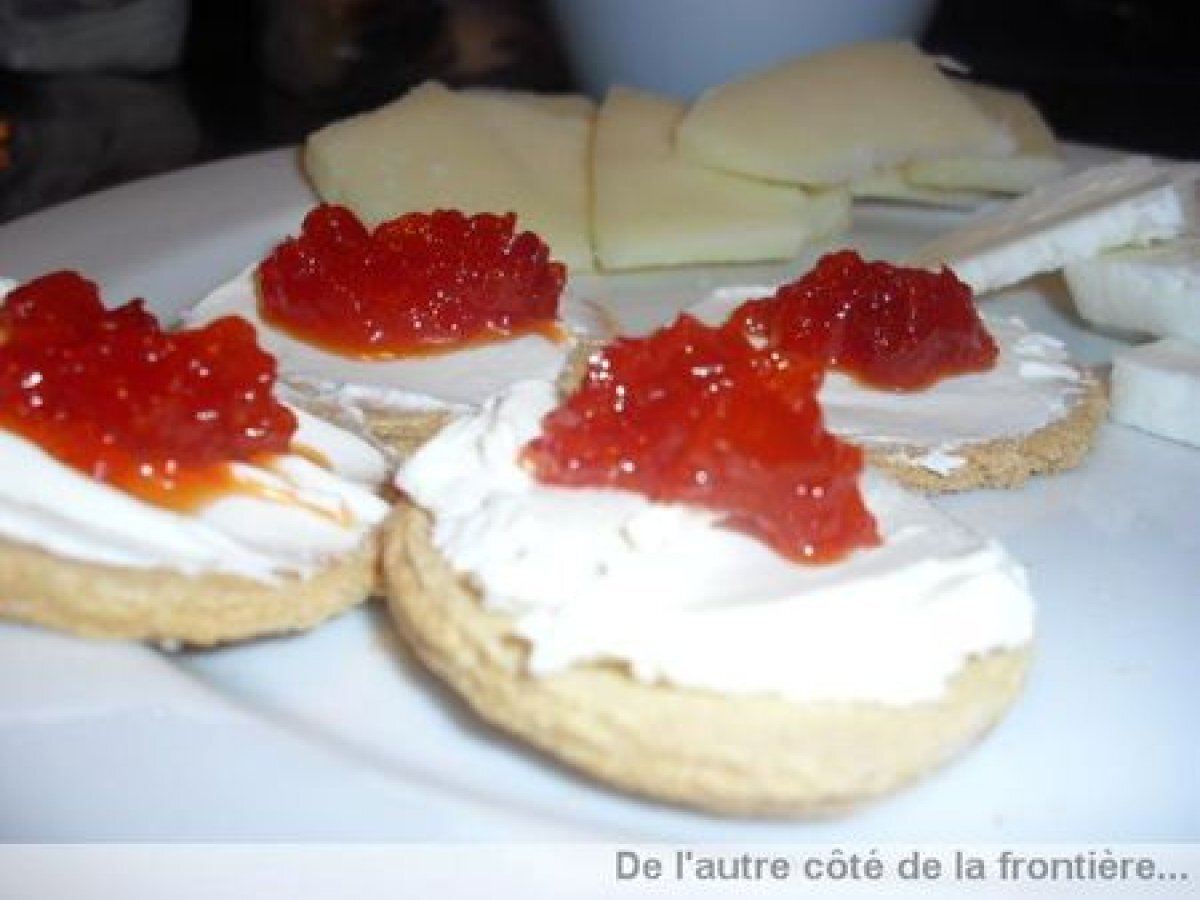 Toasts fromage frais-poivrons confits votez maintenant PrécédentSuivant Apéritiffacile10 min161 Kcal Envoyer cette recette à un ami Imprimer cette page Poser une question à l'auteur Publier votre photo de cette recette Ingrédients 4 200 g de poivrons rouges 100 g de sucre 100 g d'eau 50 g de vinaigre Pour les toasts : la confiture de poivrons bien froide des mini-biscottes du fromage frais