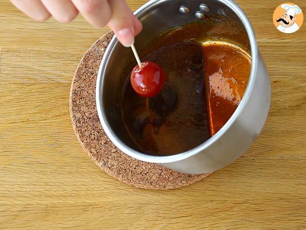Avant que le caramel ne durcisse, penchez la casserole et trempez chaque tomate afin de l'enrober de caramel.