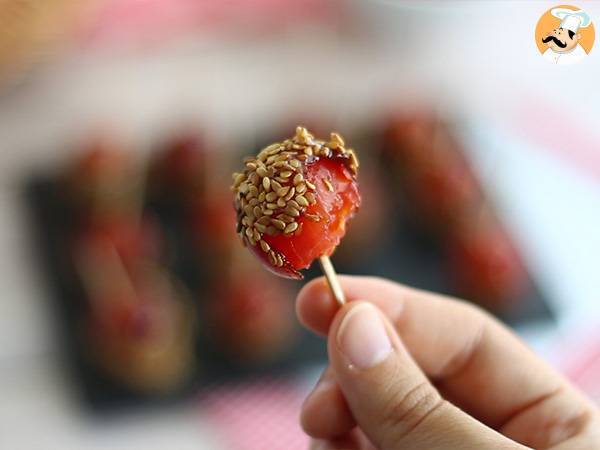 Vous qui aimez le sucré/salé, vous allez adorer picorer nos petites tomates cerises pour l'apéritif ! Réalisez un bon caramel maison, trempez-y vos tomates cerises croquantes et parsemez le tout de graines de sésame ! L'occasion de déguster une version "salée" des pommes d'amour ;-)